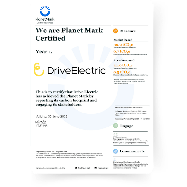 DriveElectric is proud to announce that we are now Planet Mark certified, demonstrating our commitment to reducing our environmental impact. As part of this certification, we have pledged to measure and reduce our carbon footprint annually, actively working to cut emissions, enhance sustainability practices, and engage our entire team in this important process.