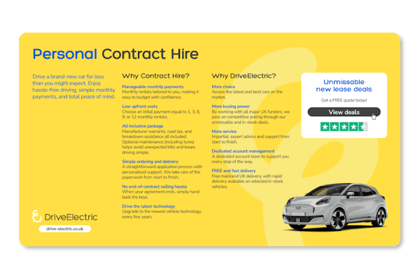 Once you have chosen your electric car we will give you a personalised quote based on your selected terms. There are no hidden extras so, providing you return the vehicle within the terms of your contract, you will know exactly how much the vehicle is going to cost you each month. This is known as a Personal Contract Hire agreement – which is another way of saying lease agreement