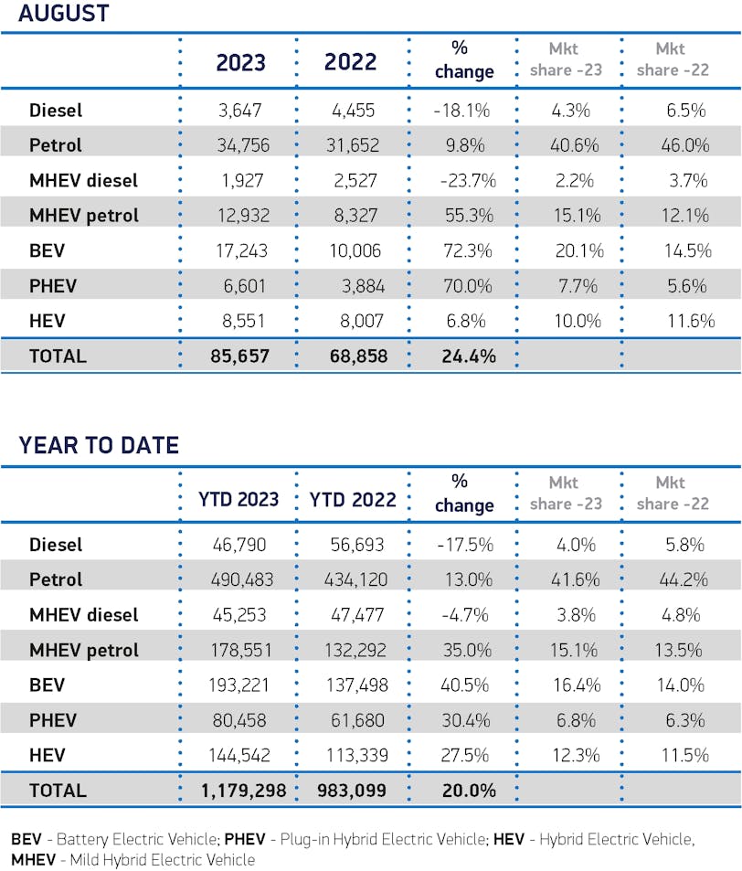Overall, the new car market grew 24.4% in August, with the increase driven by a surge in registrations by large fleets, rising 58.4% to 51,951 units, while business registrations grew 39.4% to 1,635 units. There has been a total of 623,637 fleet registrations to date in 2023, and 28,219 business registrations, for all powertrain types.