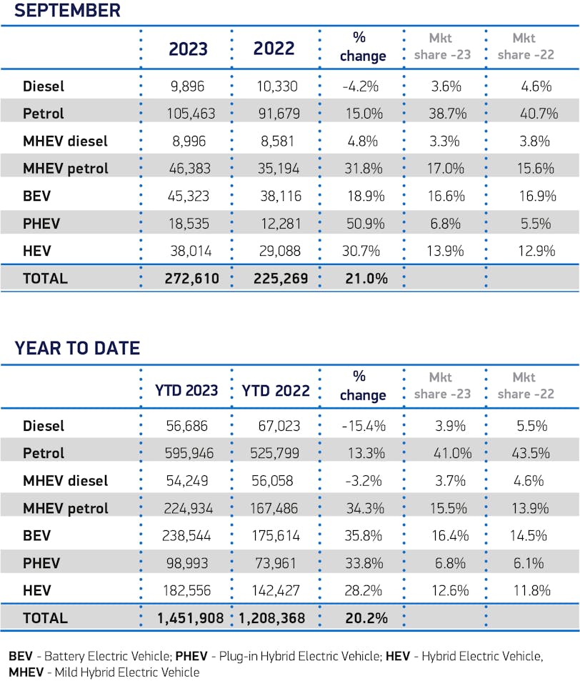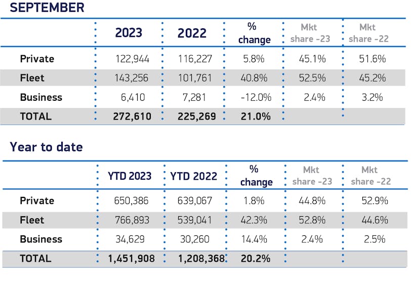 Overall, the UK's new car market grew 21.0% in September with 272,610 registrations in the month. Growth continued to be driven by large fleets, which rose 40.8% to 143,256 units to reach a market share of 52.5%. This represents a market rebalancing after constrained supply in 2022 restricted deliveries to business and fleet customers.