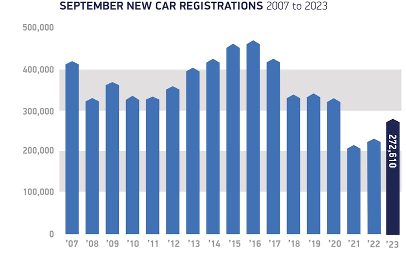Registrations of new battery electric vehicles were 16.6% of the total new car market in September 2023 - a month when the new registration plate change happened.