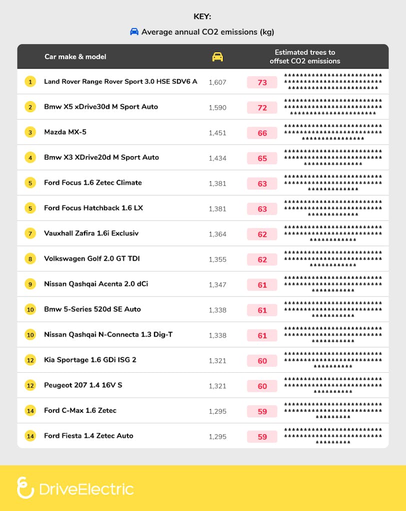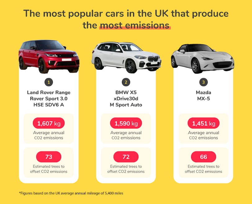 And the car that produces the third-most emissions in the UK is the Mazda MX-5, with an average of 1,451kg of CO2 produced annually. You would have to plant at least 66 trees to offset those emissions with this car.