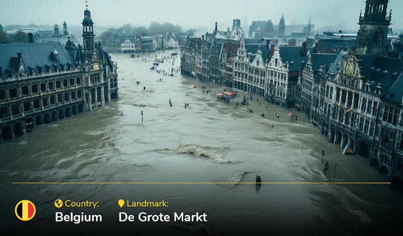 Antwerp, the location of De Grote Markt, has been flagged as one of the European regions most at risk from flooding due to climate change. This risk is mainly due to the rising sea levels caused by the increasing temperatures, melting glaciers and ice sheets. As seawater warms, it also expands, contributing to the issue.