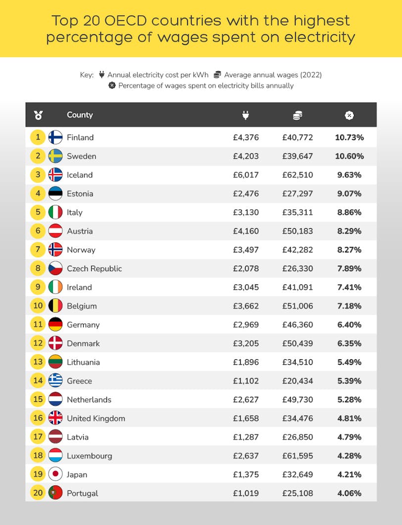 Iceland takes the third spot, with its residents spending around 9.63% of their average annual wage on electricity. This is based on their average annual electricity consumption being 49,725 kWh and the cost of electricity being £0.12, meaning the average annual electricity bill is around £6,017.