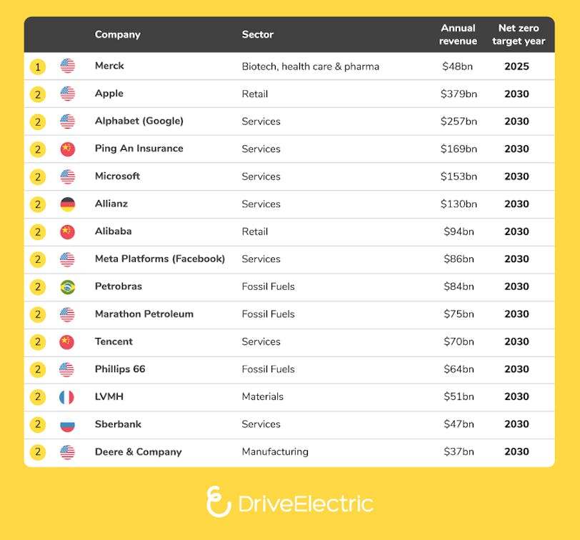 2. Apple, Alphabet (Google), Microsoft, Meta Platforms (Facebook), Alibaba, Ping An Insurance, Allianz, Petrobras, Marathon Petroleum, Tencent, Phillips 66, LVMH, Sberbank, Deere & Company | Net zero target year: 2030