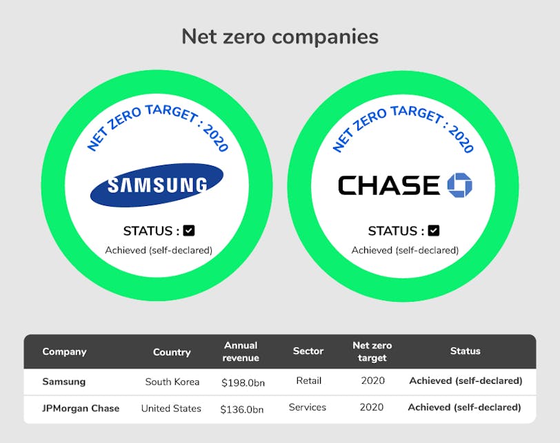 1. Samsung, JPMorgan Chase | Net zero target year: 2020 | Status: Achieved (self-declared)