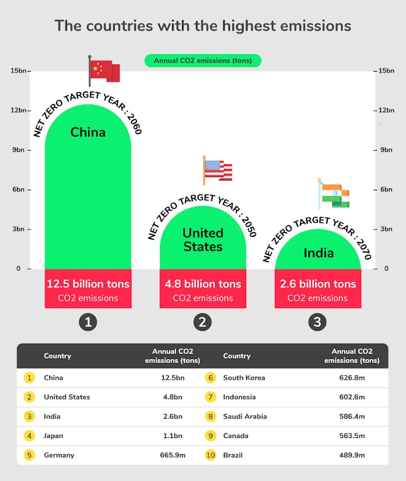 1. China | CO2 emissions: 12.5 billion tons | Net zero target year: 2060