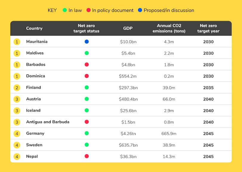 1. Maldives, Barbados, Dominica, Mauritania | Net zero target year: 2030