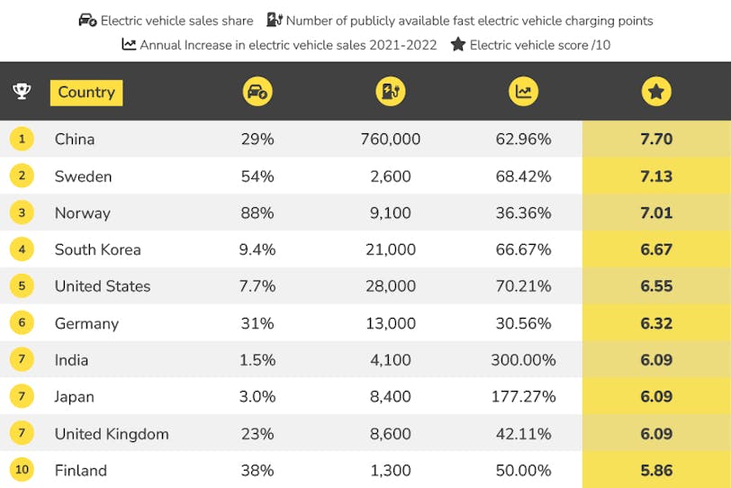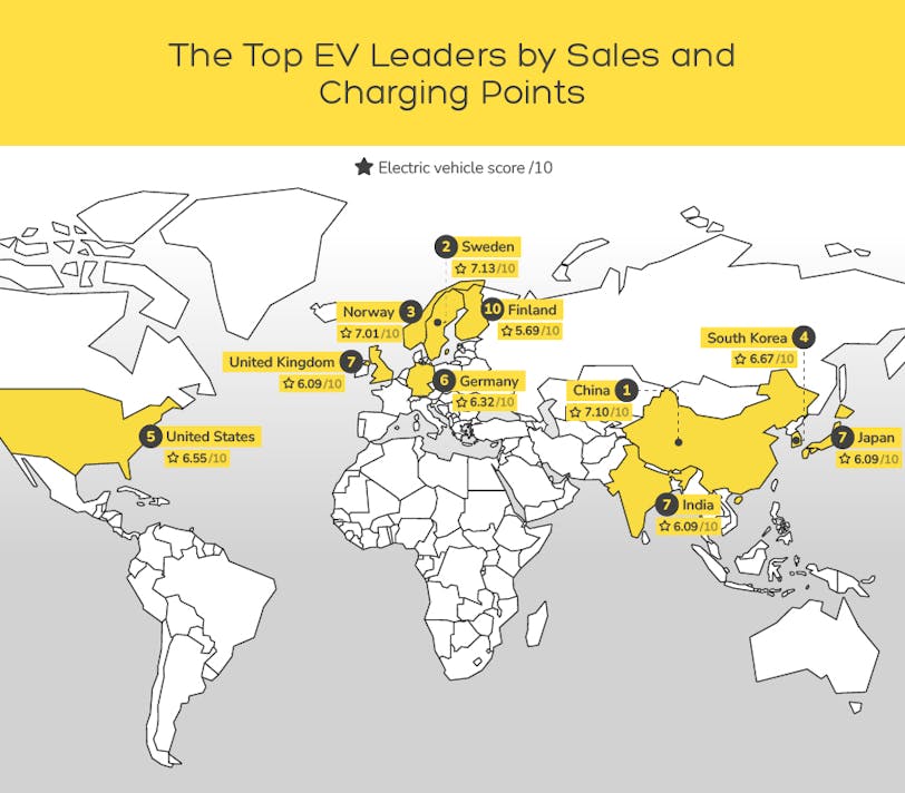 We used IEA’s global data explorer to look at each available country’s EV charging points (publicly available fast), EV sales as a % of the national total, and the annual increase in EV sales from 2021 to 2022. We took each country’s results for every factor and then normalised them against each other to receive a score out of 10.