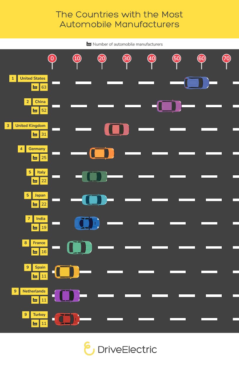 We sourced automobile manufacturers by country using Wikipedia to count the number of manufacturers by country.