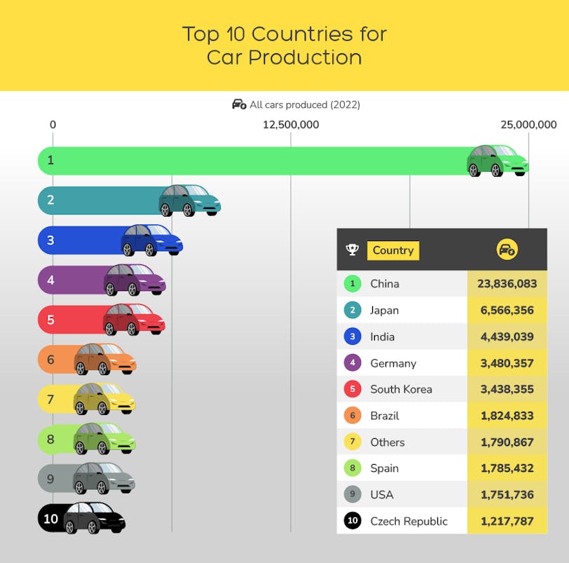 China was followed by Japan (almost 7 million), India (4.4 million), Germany (3.48 million), and South Korea (3.43 million), which are countries home to valuable car brands worldwide.