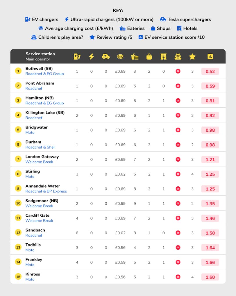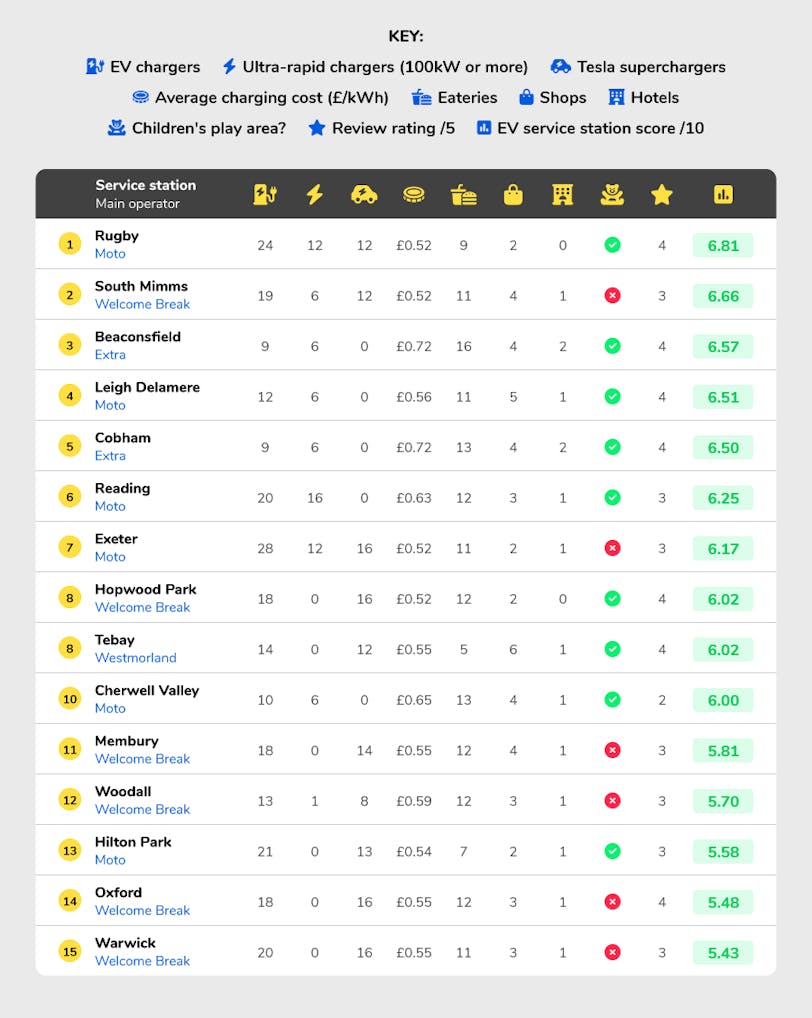 - To calculate the EV service station score out of 10 we gave each motorway service station a score out of 10 for each factor, giving each factor equal weighting. We then calculated the average score of each service station across all factors to find the EV service station score out of 10 which formed the basis of our ranking.