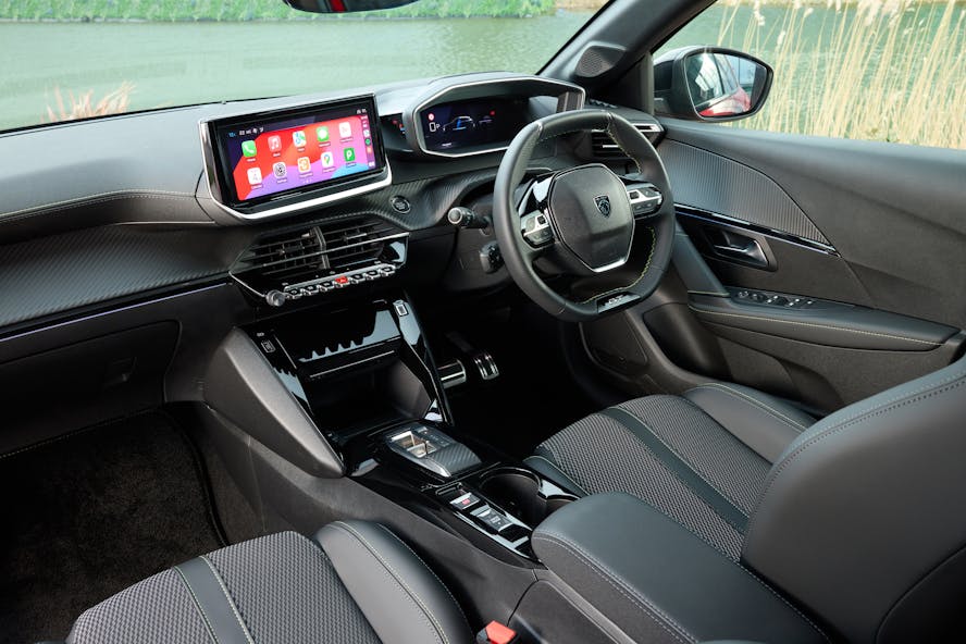 For safety, the e-208 GT comes with automatic emergency braking, lane-keeping assist, and traffic sign recognition as standard, making it one of the safer small EVs on the market. Additionally, the dynamic ambient lighting available on the GT trim allows you to set the interior mood with eight colour options, further enhancing the driving experience.